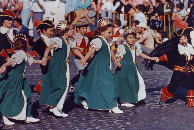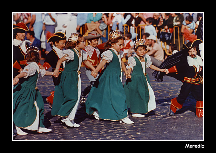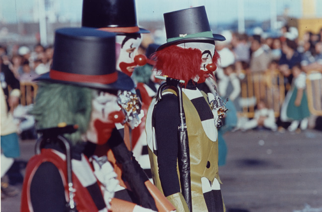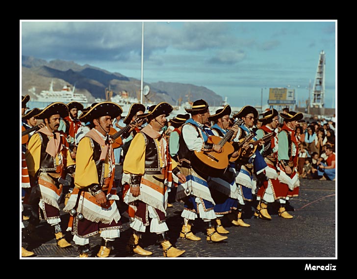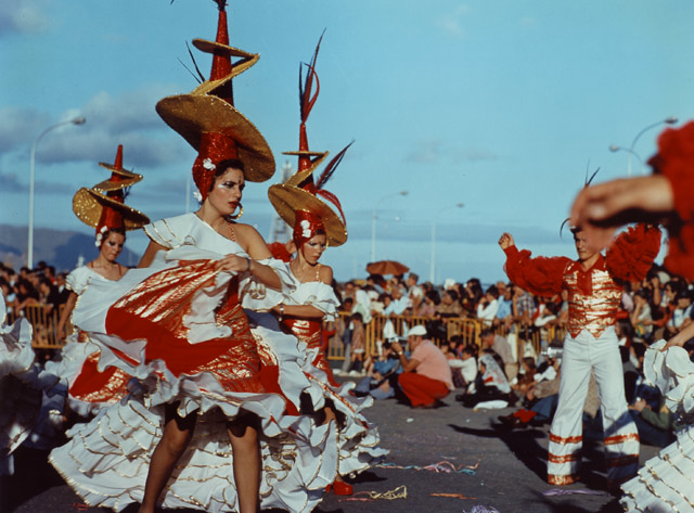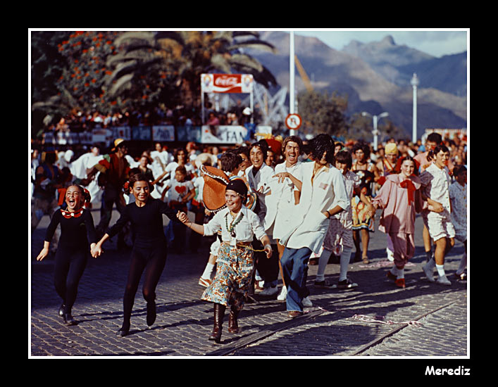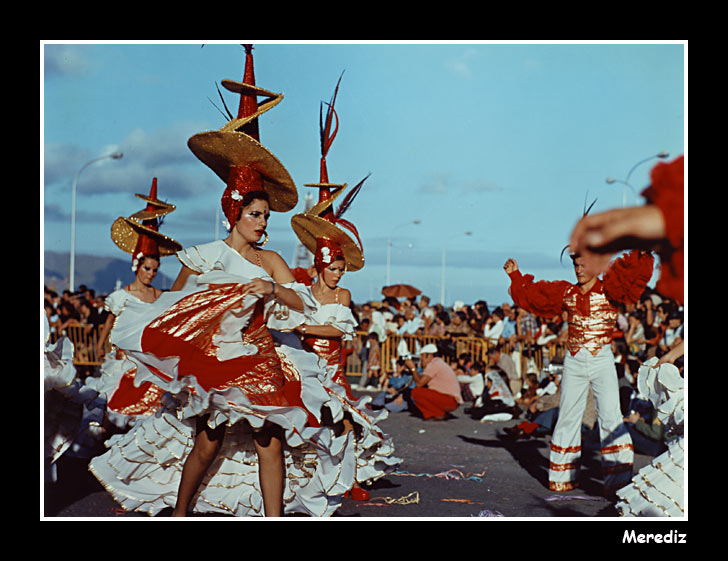 Comentario: Foto igualmente sin recorte, y mejorada en contraste, color y enfoque. Es posiblemente una de las fotos más representativas de una época: en el desfile de Santa Cruz de Tenerife, que dura varias horas, al final desfilaban los grupos de menos posibilidades económicas para confeccionarse trajes vistosos, lo que no impedía que el nivel de alegría fuese incluso más exteriorizado.