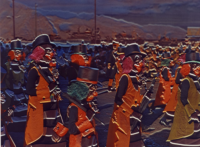 Comentario: Titulada por Merediz “Radiografía de los carnavales”, obtuvo un premio en el Certamen de Fotografía organizado anualmente en aquella época por la caja de Ahorros de Asturias. Es la fotografía de la que más podemos aprender, ya está MUY TRABAJADA: para obtener el relieve conseguido, se hizo de la diapositiva un Internegativo en blanco y negro al mismo tamaño que la diapositiva; y posteriormente juntando diapositiva y negativo con una mínima separación del conjunto se obtuvo un Internegativo en color en 9×12 placa. Hoy en día con la diapositiva en papel fácilmente podría conseguirse el mismo efecto con la utilización del Photoshop.