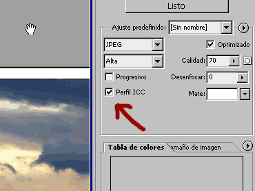 Por último guardais para web, acordaros de marcar la casilla perfil icc: