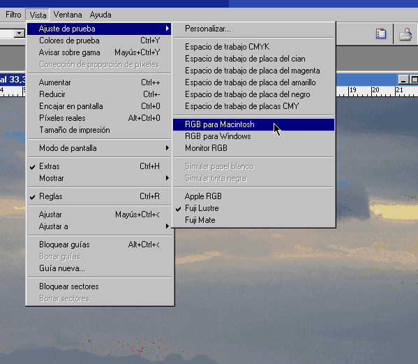 ¿qué pasa si uso mac y tengo la gamma configurada a 1.8 y no a 2.2 como el perfil sRGB. Lo que pasará es que al ver la foto en el navegador la vereis algo «lavada». Para evitar eso podeis simular el color rgb de macintosh en photoshop y darle un poco mas de contraste a la foto, para hacerlo vais a vista>ajustes de prueba>RGB para Macintosh.