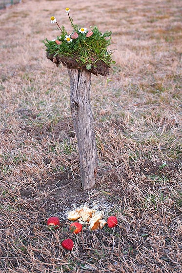 Debajo de ella podéis ver la comida que en esta ocasión les puse. La estaca sola queda un poco sosa y fea para hacer una foto, así que la suelo adornar con algo, en esta ocasión la puse así.