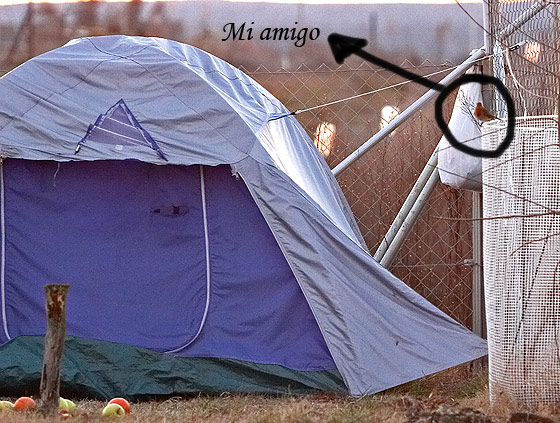 En esta foto de pésima calidad podéis ver donde esta posado el petirrojo antes de tirarse a comer: